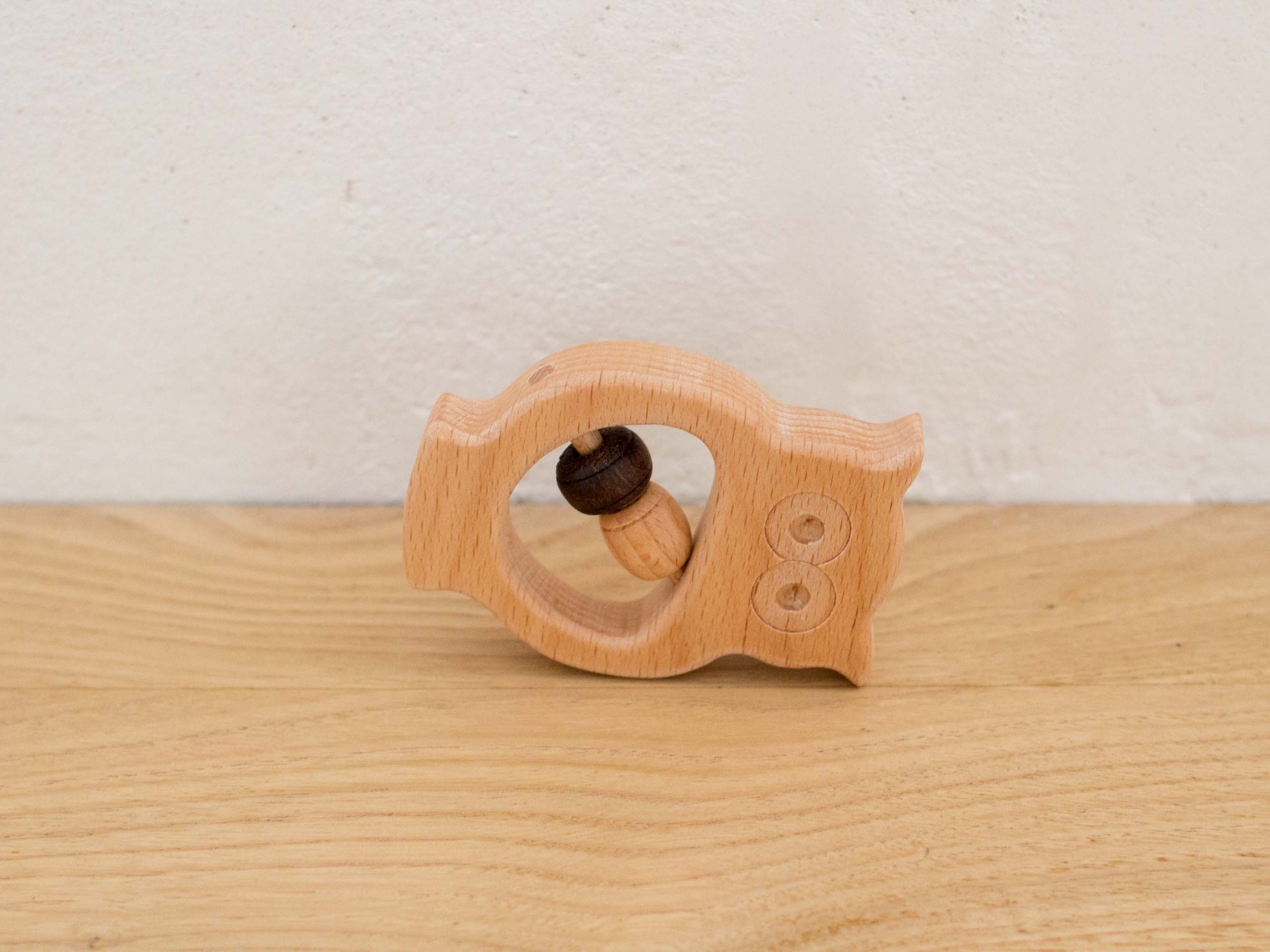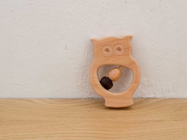 Hochet en bois massif en forme de hibou, avec deux perles en noyer et hêtre.